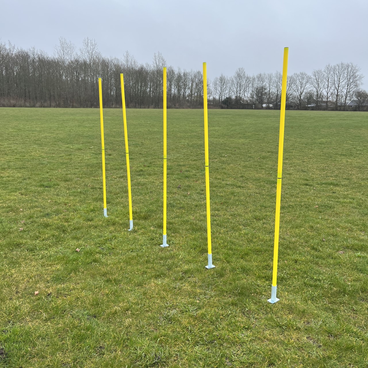 - Agilitystænger i to delt design – 5 stk x 150 cm stænger med fjeder jordspyd.