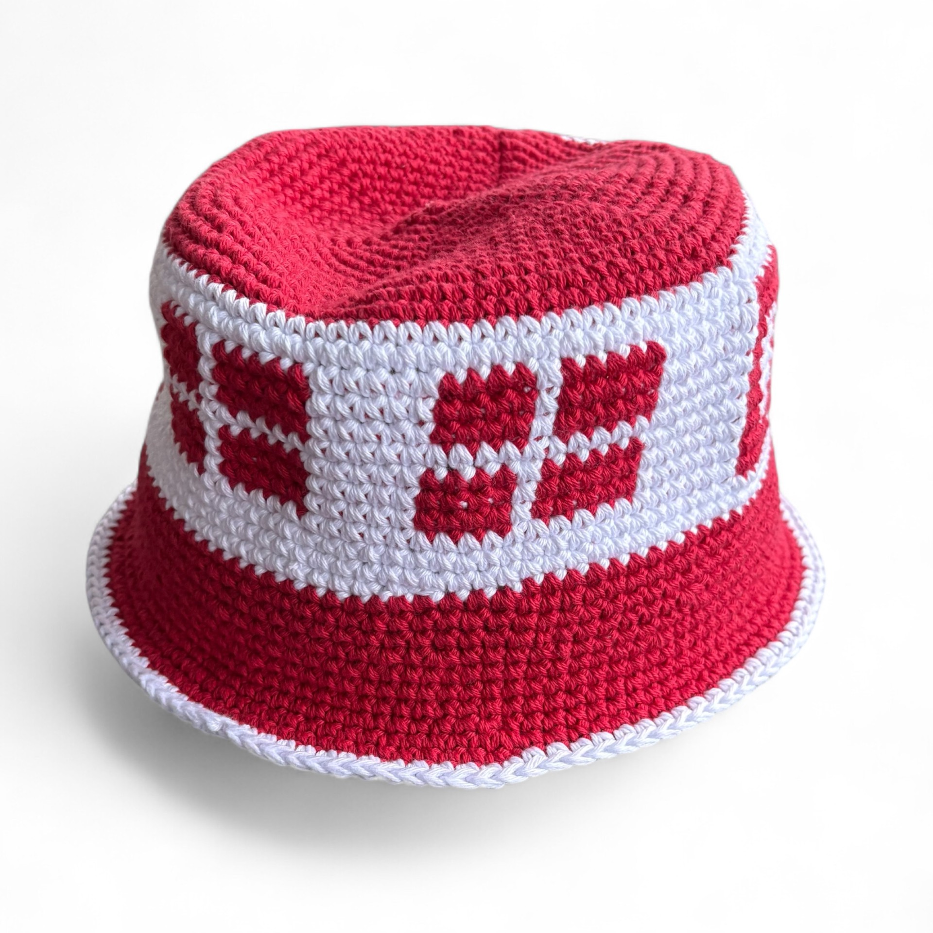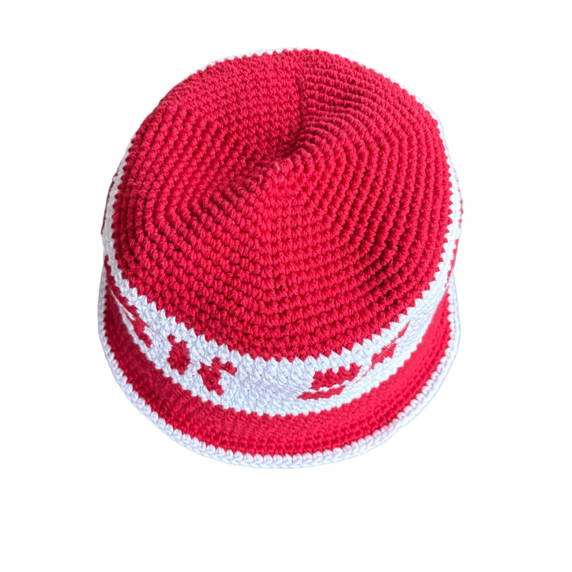 Hæklet Danmarks bøllehat i rød og hvid – Håndlavet